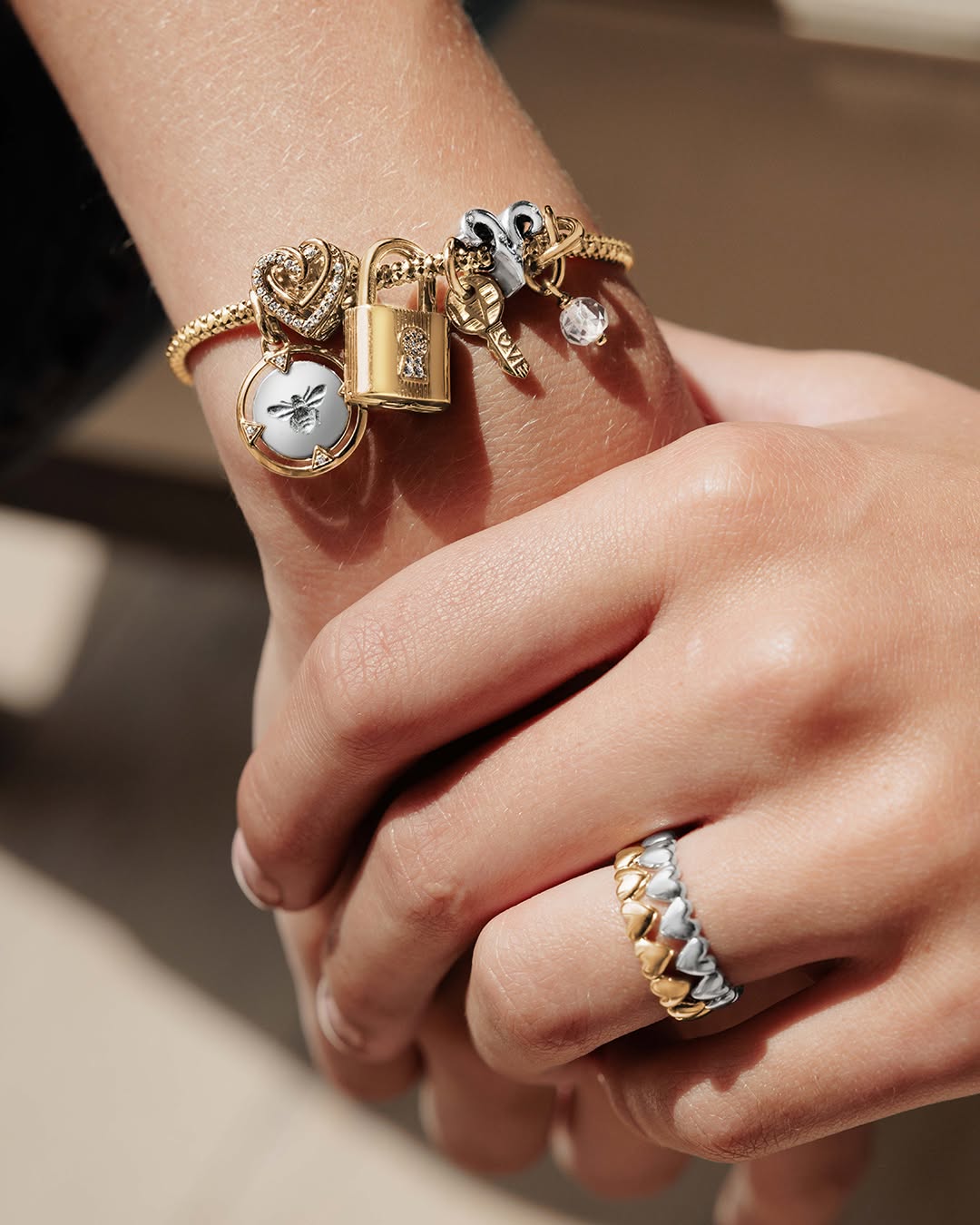- Choose a rose gold Pandora bracelet as the focal point.